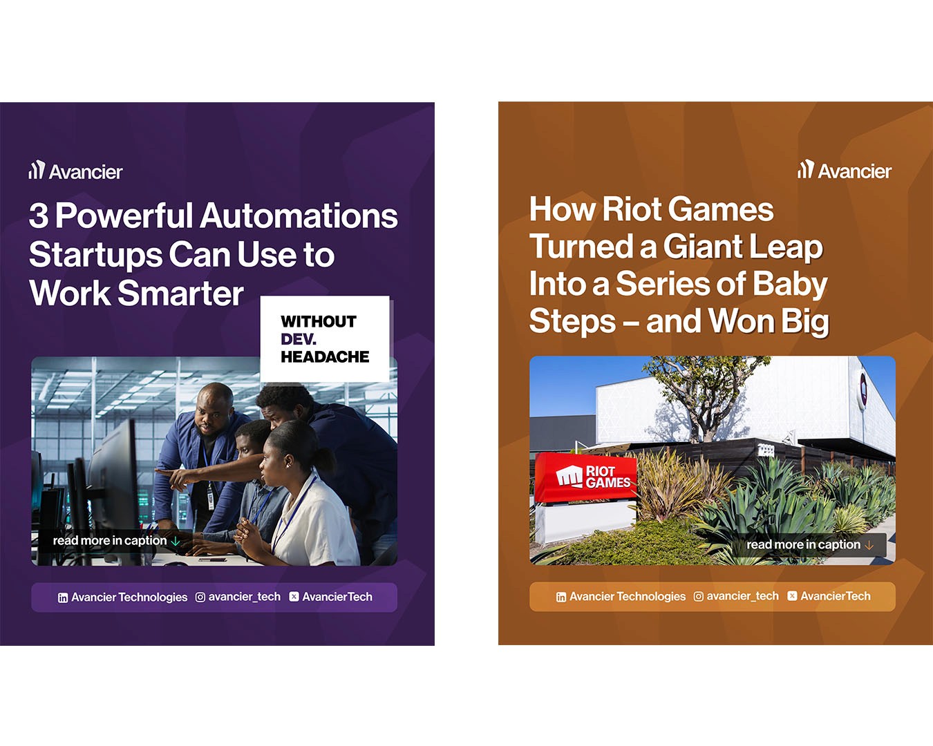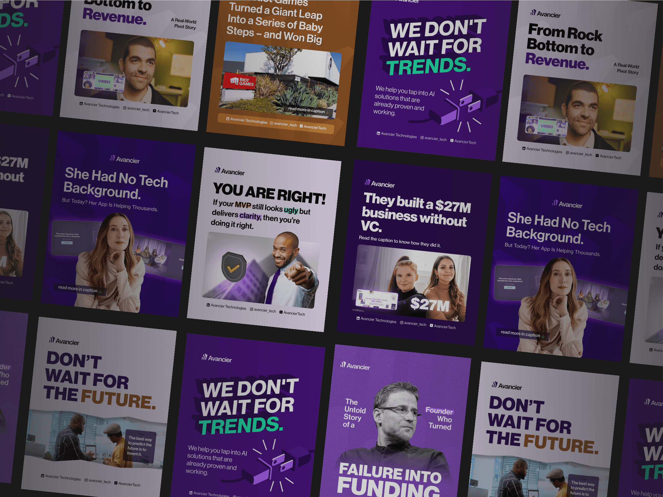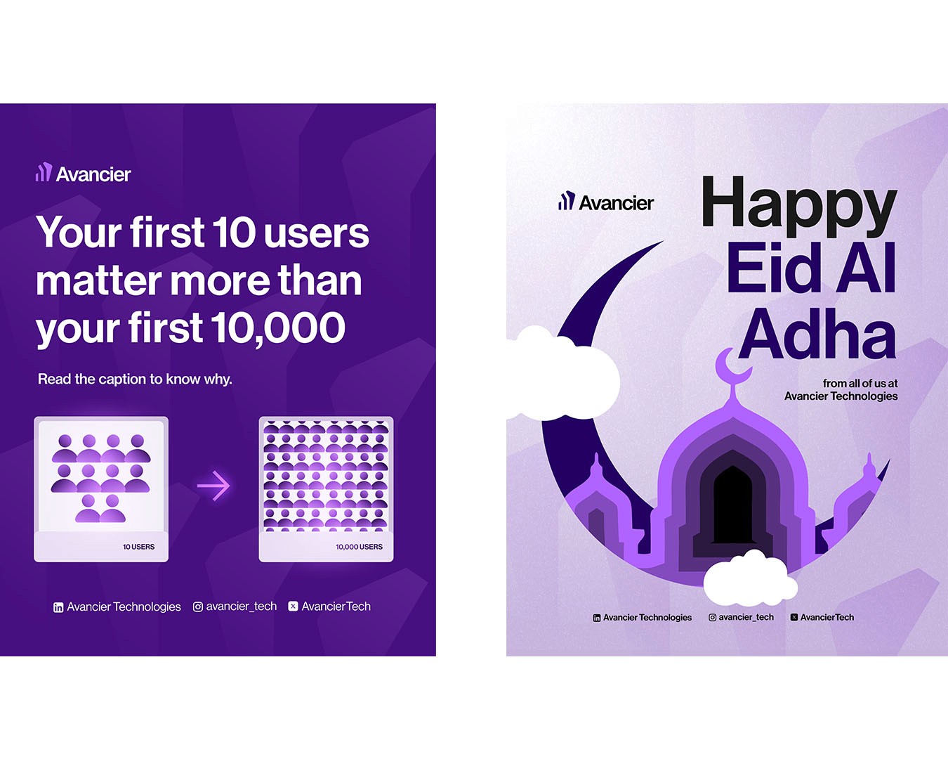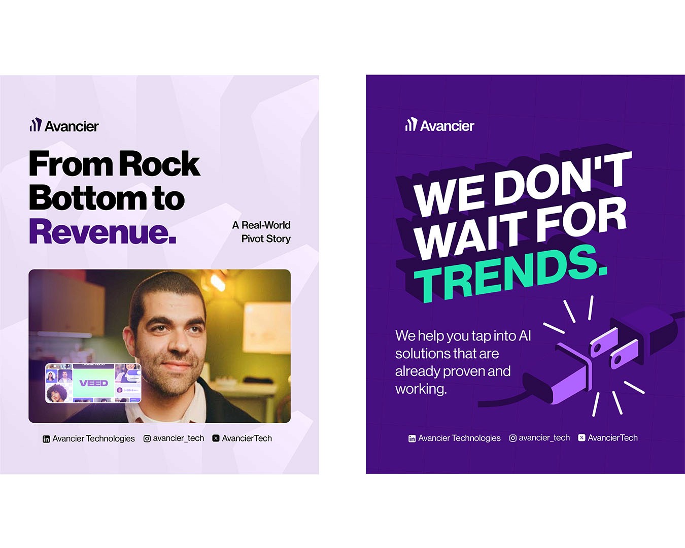 A curated selection of social media flyers designed for Avancier Tech, showcasing clean layouts, sharp messaging, and a consistent visual identity tailored for digital engagement.