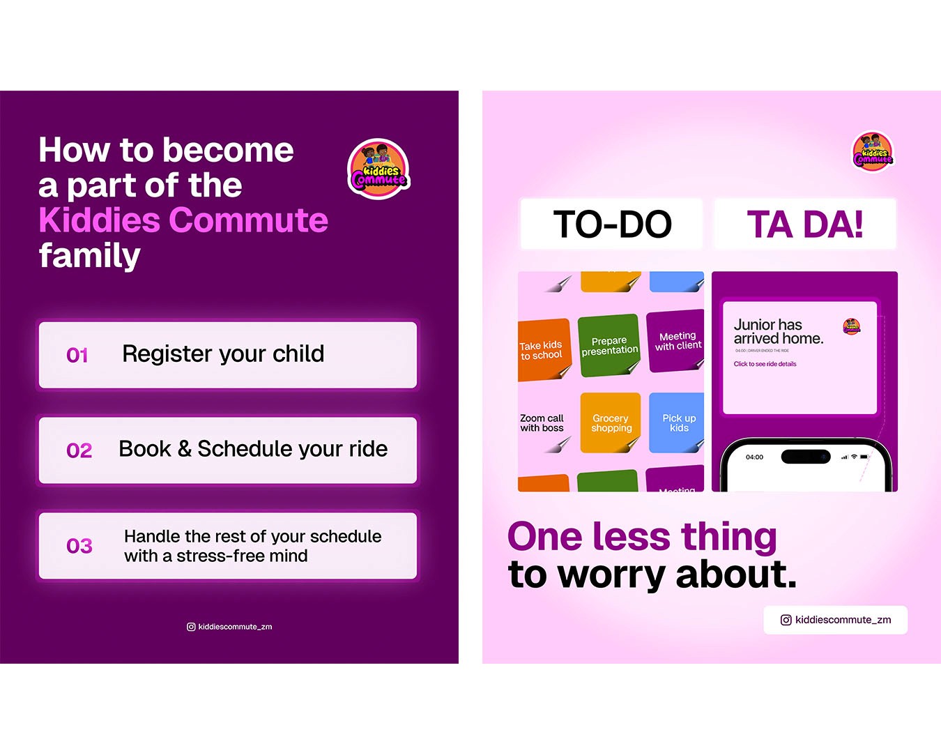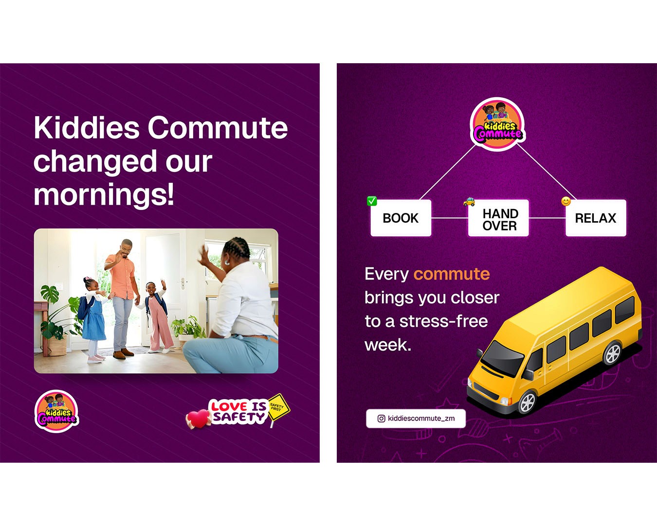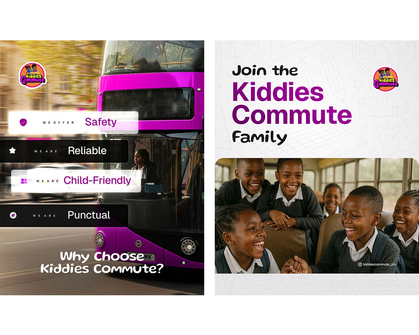A curated selection of social media flyers designed for Kiddies Commute Zambia, showcasing clean layouts, sharp messaging, and a consistent visual identity tailored for digital engagement.